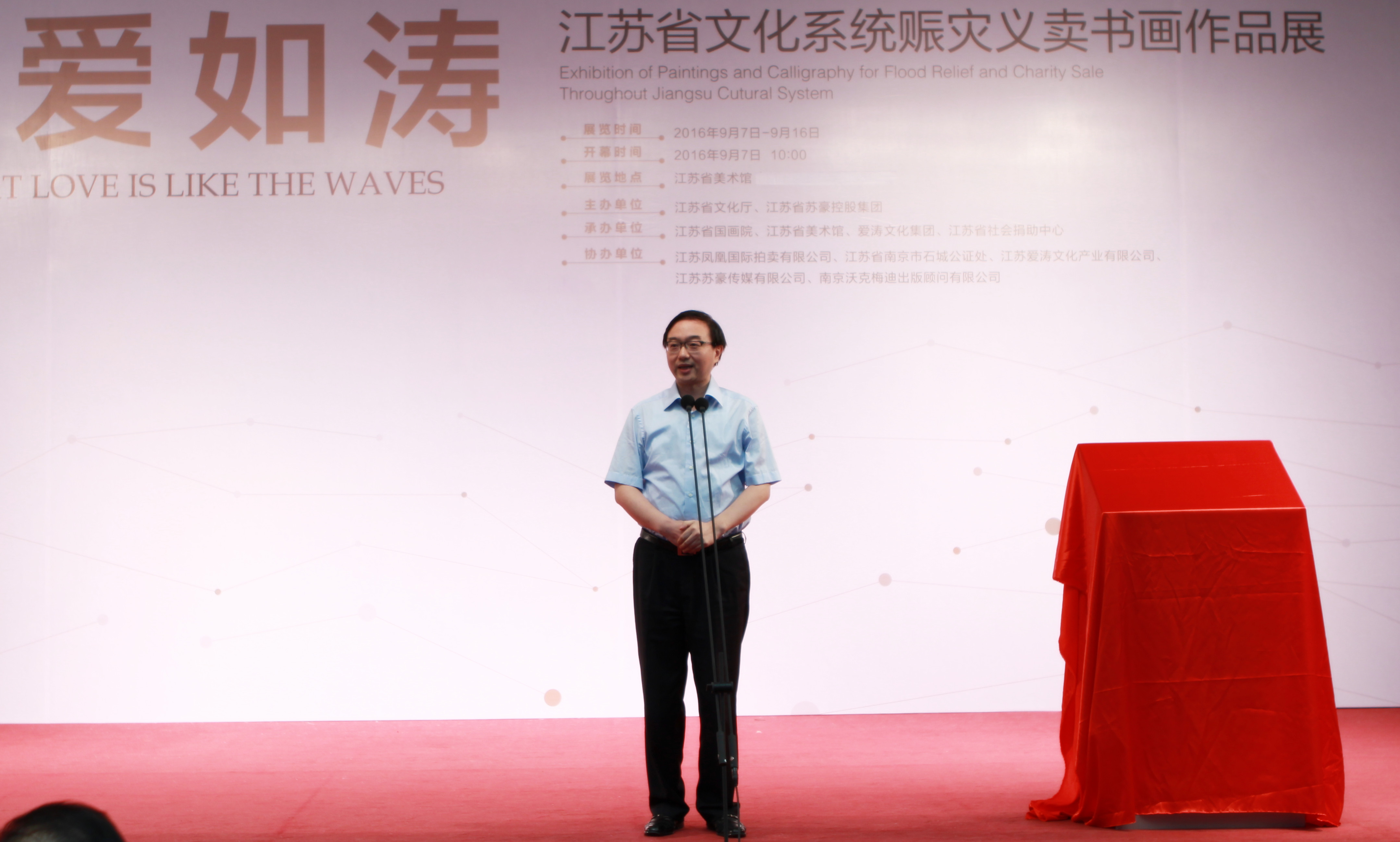 由江苏省文化厅、江苏省苏豪控股集团共同主办,江苏省国画院、江苏省美术馆、爱涛文化集团、江苏省社会捐助中心共同承办的“大爱如涛——江苏省文化系统赈灾义卖书画作品展”,于9月7日在江苏省美术馆正式开幕,为期10天。并同步出版发行由苏豪控股集团董事长王正喜主编的《大爱如涛——江苏省文化系统赈灾义卖书画作品集》。
