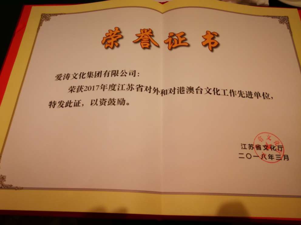 爱涛文化集团荣获2017年度江苏省对外和对港澳台文化工作先进单位称号
