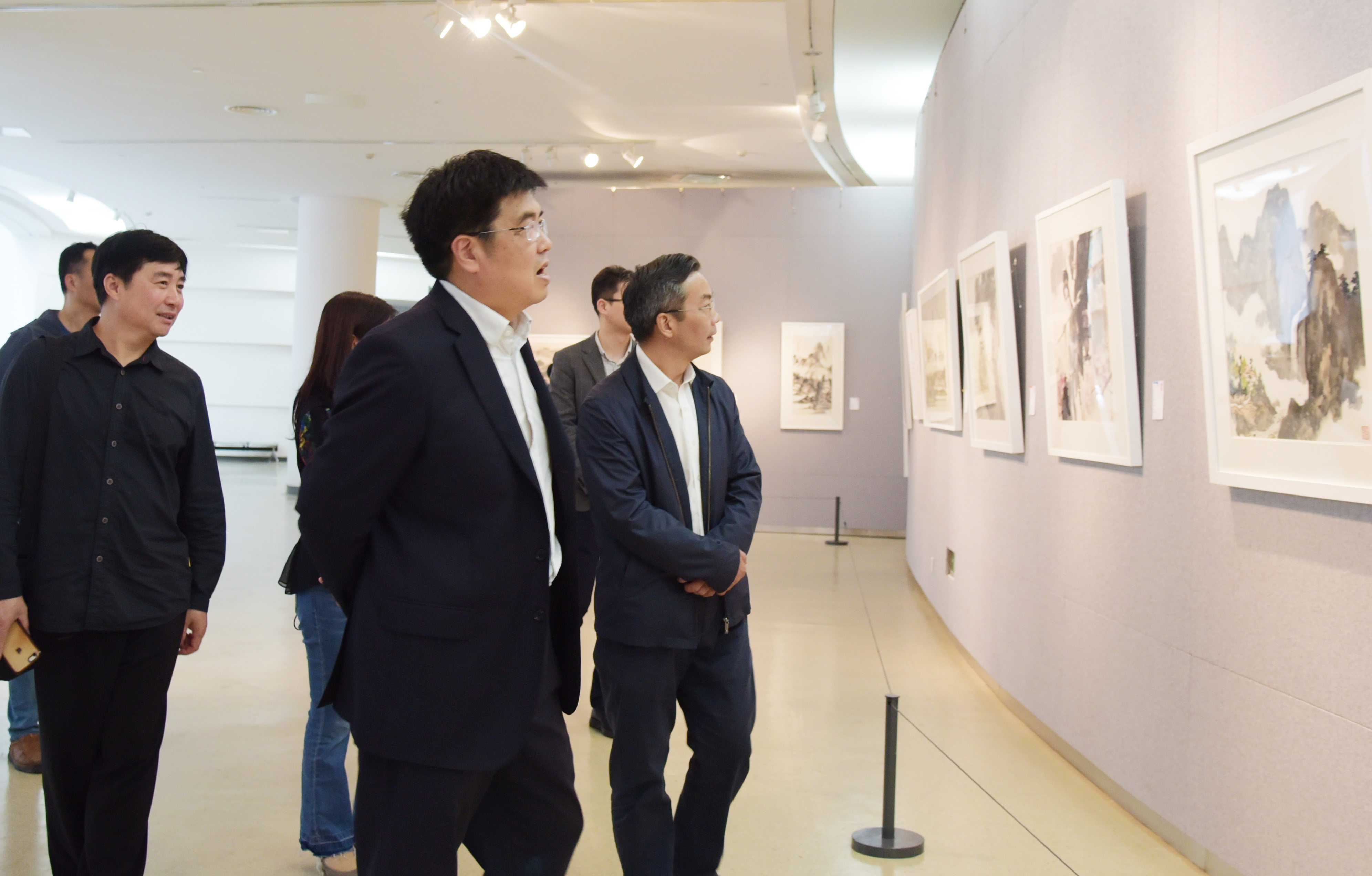 随后,李啸院长还带领书画爱好者和学生们一同参观画展,现场为大家讲解新金陵画派的特点与传承。《新金陵画派运河沿岸艺术交流展》分为四大篇章:一是“九老" 傅抱石等人作品,反映了当时新中国的人民生活和社会精神; 二是当代艺术家宋玉麟等作品,讲述了当代艺术家继承新金陵画派理念在艺术上的创新,在文化上的包容与传承;三是“新生代”作品,聚焦创作创新、多元化、百花齐放; 四是巡展城市交流作品,展现运河沿岸多种文化交流的繁荣发展。
